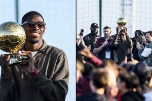 法国足协晒照,登贝莱回到成长之地埃夫勒,向家乡人民展示了他的金球奖。