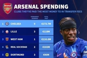 爱好改装车!德转列阿森纳近20年采购榜:1.74亿欧从切尔西买9人