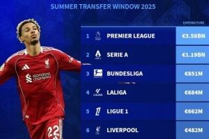 今夏各联赛支出:英超35.8亿超四大联赛总和 利物浦4.82亿可排第6