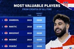 克罗地亚球员历史身价榜:格瓦迪奥尔8000万欧居首,拉基蒂奇次席